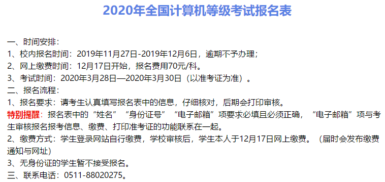我校2020上半年全国计算机等级考试开始预报名,请班主任通知学生用手机或电脑登陆填报🪪👨🏿✈️,网址https://www.wjx.top/jq/50954070.aspx,校内报名12月7日截止,后面汇总打印给学生签字确认,详见如下: