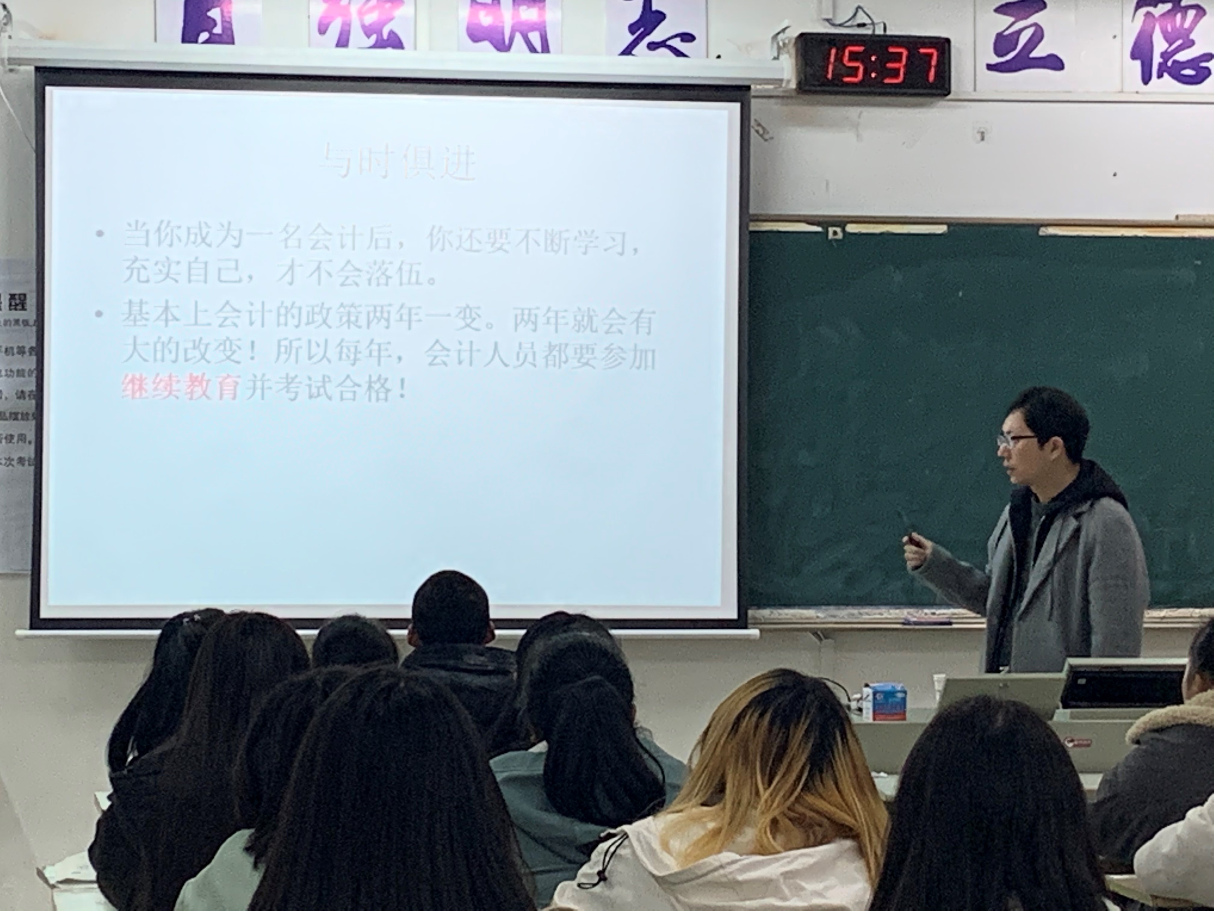 讲座分成会计理论和税务实务两个部分。于经理从对会计的认识、新时代好会计的标准以及如何学好会计三个方面展开分享,他围绕会计的演化、会计的特征🧎🏻、会计重要性等方面作了详细的阐释🖖🏿。他还结合扬中市会计发展现状,就会计职场、会计法规、职业道德、职称评审等问题分别作了介绍。并希望同学们积极适应新时代的发展,不断拓展专业视野,丰富知识结构。