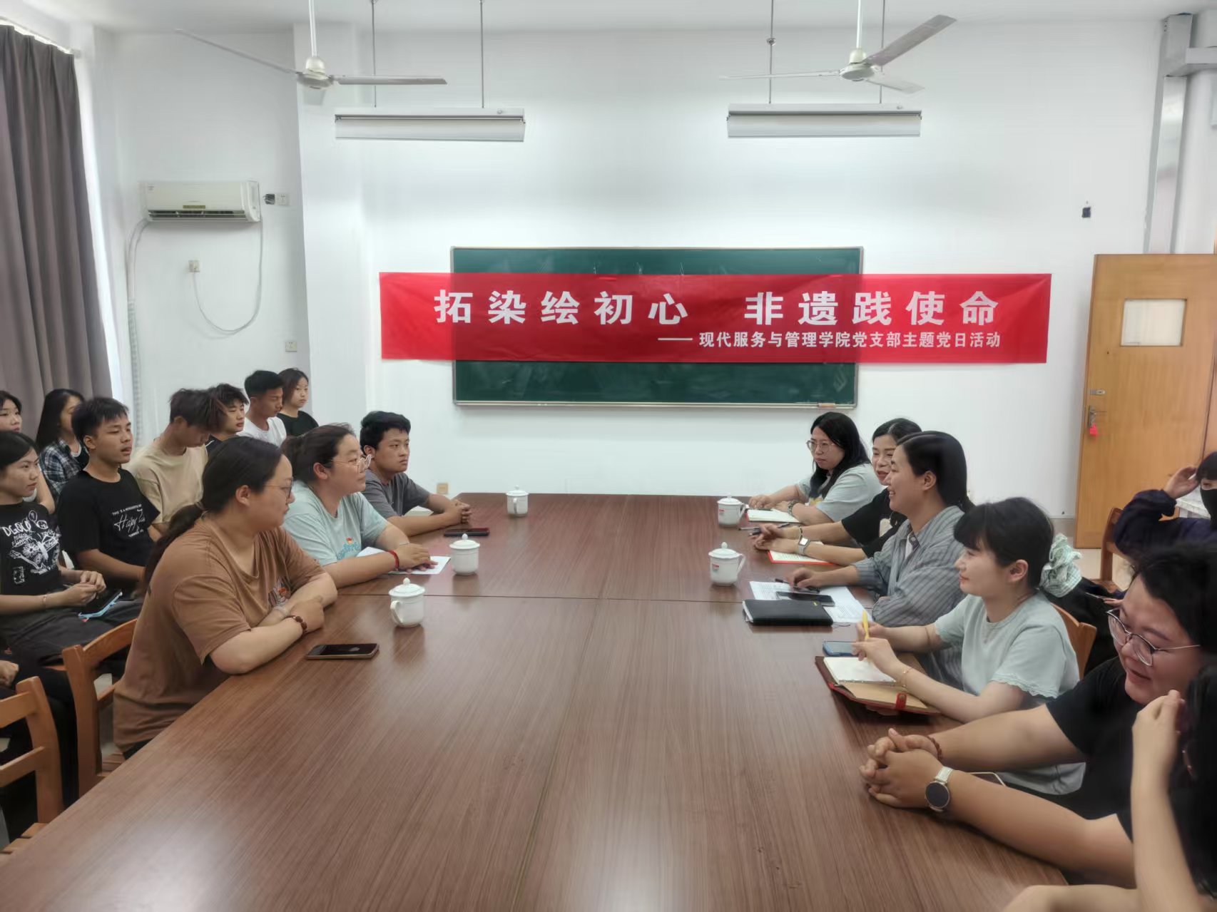 ——现代服务与管理学院党支部主题党日活动   为创新党员教育形式🛝,推动传统文化与党性教育深度融合,5月21日下午🦹🏼‍♂️,现服学院党支部举办了“拓染绘初心✍️,非遗践使命”的主题党日活动...