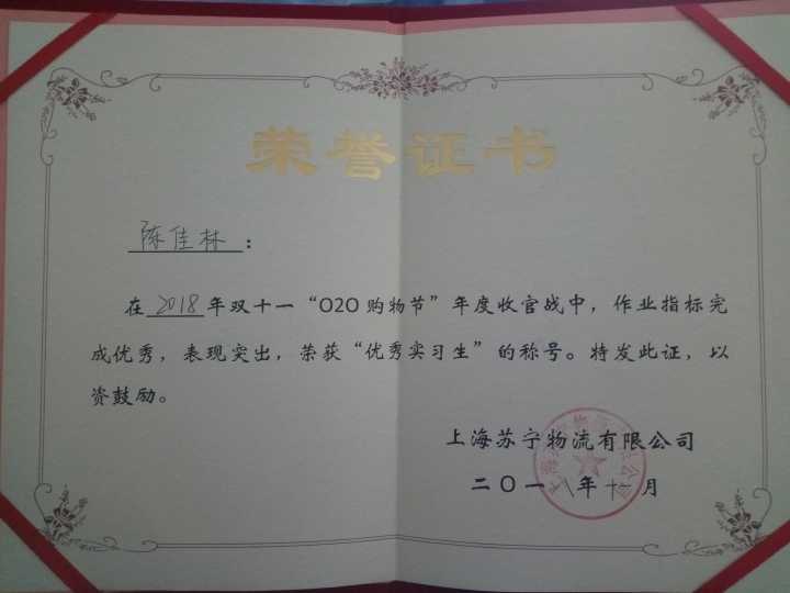 11月26日🔴,上海苏宁物流公司3C小件仓储部门开展员工表彰大会💆♀️,我系6名实习生接受了表彰。在表彰大会上,仓储部门总经理常春雨进行讲话,强调在双十一期间上海苏宁物流在全国苏宁物流中发货量第一,工作指标完成率120%🏌🏼,3C小件仓储部在本基地发货量第一,这样的成就离不开每一个员工的辛勤工作。
