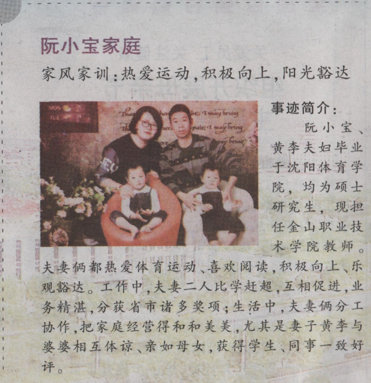 在此次评选中🦵🏽,我院阮小宝老师家庭从众多参选者中脱颖而出,荣获“文明家庭标兵户”称号。