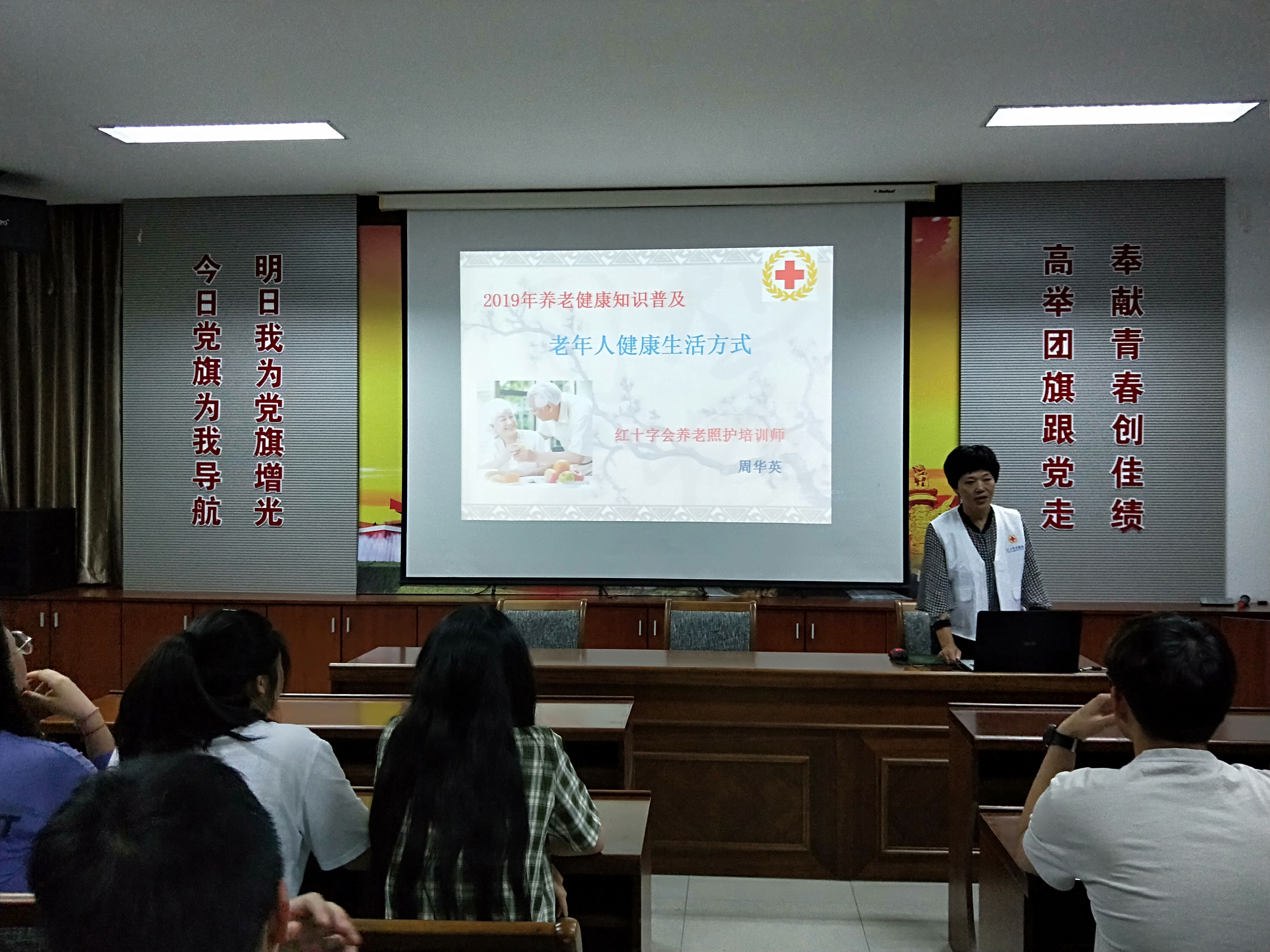 2019年6月25日晚上7点,我院团委、红十字会与扬中市红十字会联合在学院大学生活动中心二楼党员活动室开展养老照护业务知识培训会。本次培训由扬中红十字会会员周华英老师授课,我院青年志愿者代表40余人参加。