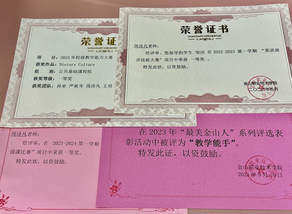 六年来周诗凡慢慢从青涩走向成熟📭🈂️,从稚嫩走向稳重,教学经验不断丰富👨🏽🦳,教学能力逐步提升👨🏿🎤,课堂掌控能力不断增强😓。获得“教学能手”和“优秀辅导员”称号;获得校级说课比赛一等奖、教学能力大赛团体一等奖;获得江苏省高校外语教师翻译大赛职业院校组三等奖👨🏻⚕️。