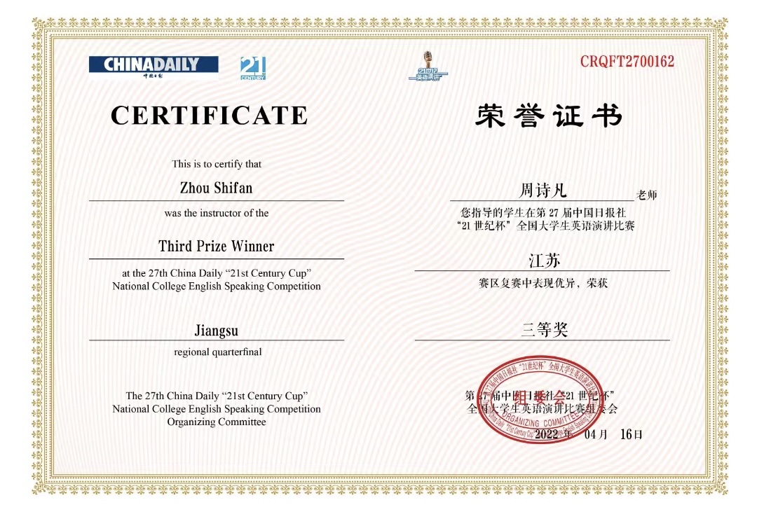 周诗凡多次指导学生获得江苏省职场英语挑战赛写作比赛三等奖🕵️♂️🧙♂️、演讲比赛三等奖🕵🏿♂️;指导学生获得词达人全国大学生英语词汇比赛国赛三等奖,省赛一等奖🦻、二等奖。注重拓宽学生国际视野,培养学生独立思考能力和批判性思维。