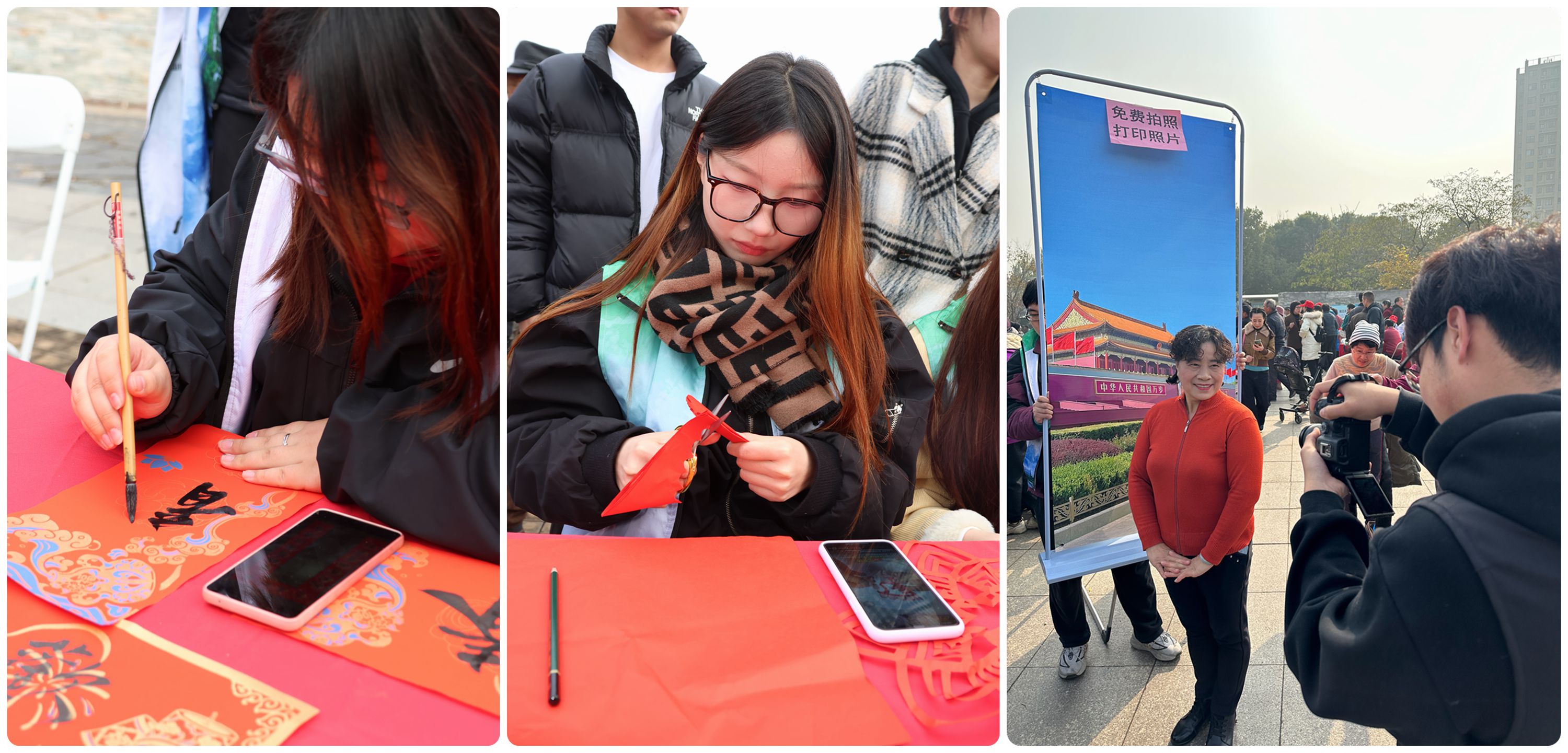 在活动现场,各所高校精心策划并实施了包括法律咨询、科技咨询🅱️、医疗服务🩶、健康咨询、文艺表演、书写春联👩🏼‍💻、剪纸等多项活动。我院关心下一代工作委员会(关工委)亦不遗余力地组织并积极参与其中,派遣工艺服务团队亲临现场,进行春联书写🧙🏼‍♂️、窗花剪裁、手工竹编以及免费冲洗照片等服务,为当地居民提供丰富的文化体验。在文艺演出环节,我院舞龙社与潮舞社的成员们呈现了精彩的表演,赢得了句容市天王镇村民的热烈掌声和高度评价,充分彰显了我院师生的卓越风采👷🏽‍♀️🏌️‍♂️。