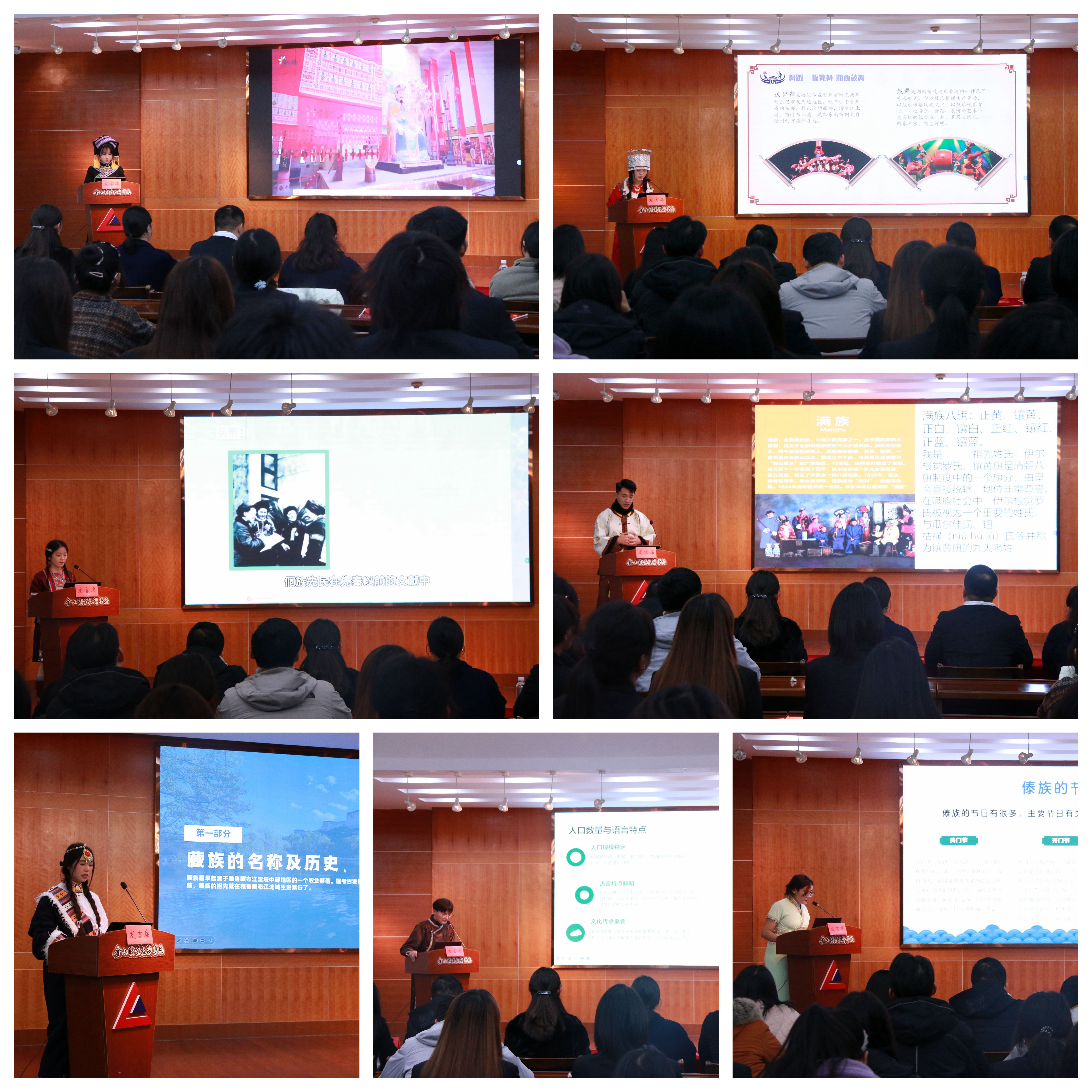 主持人孙余超老师向大家科普了我国的民族政策🙋🏽,增进大家对我国民族政策的认识和了解🧟‍♂️,使其认识到民族政策是我国政治制度的重要组成部分。活动邀请了来自瑶、苗、侗、满🧑🏻‍🍳💎、藏🪧、蒙古、傣共7个少数民族学生代表穿着传统服饰上台👰🏼🚏,生动形象的介绍本民族的历史文化🚌、风俗习惯等。