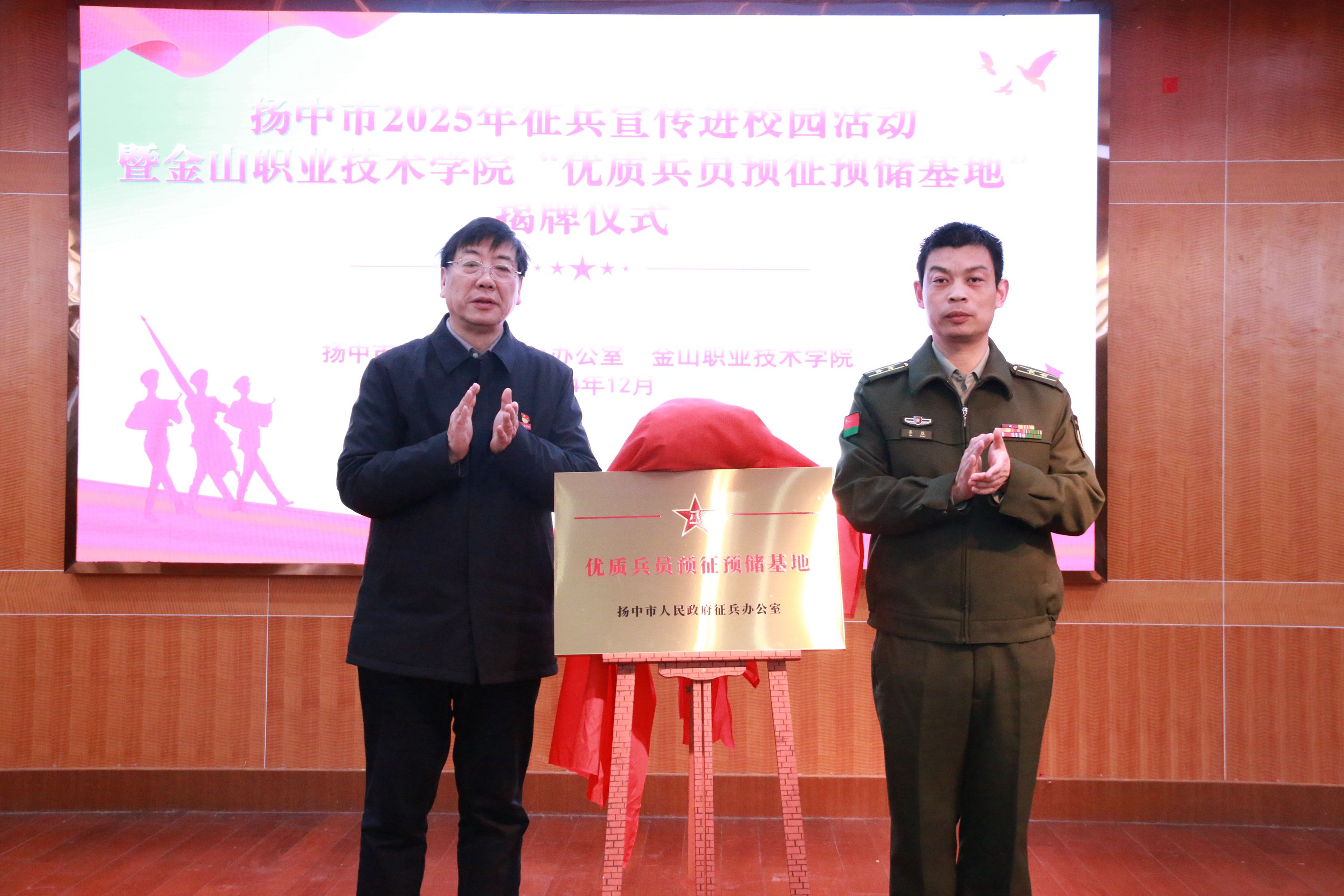 仪式上🦡,徐铭书记与秦胜部长共同为“优质兵员预征预储基地”揭牌💁🏻♀️,我院军事类社团团委国旗班还进行了刺杀操表演。