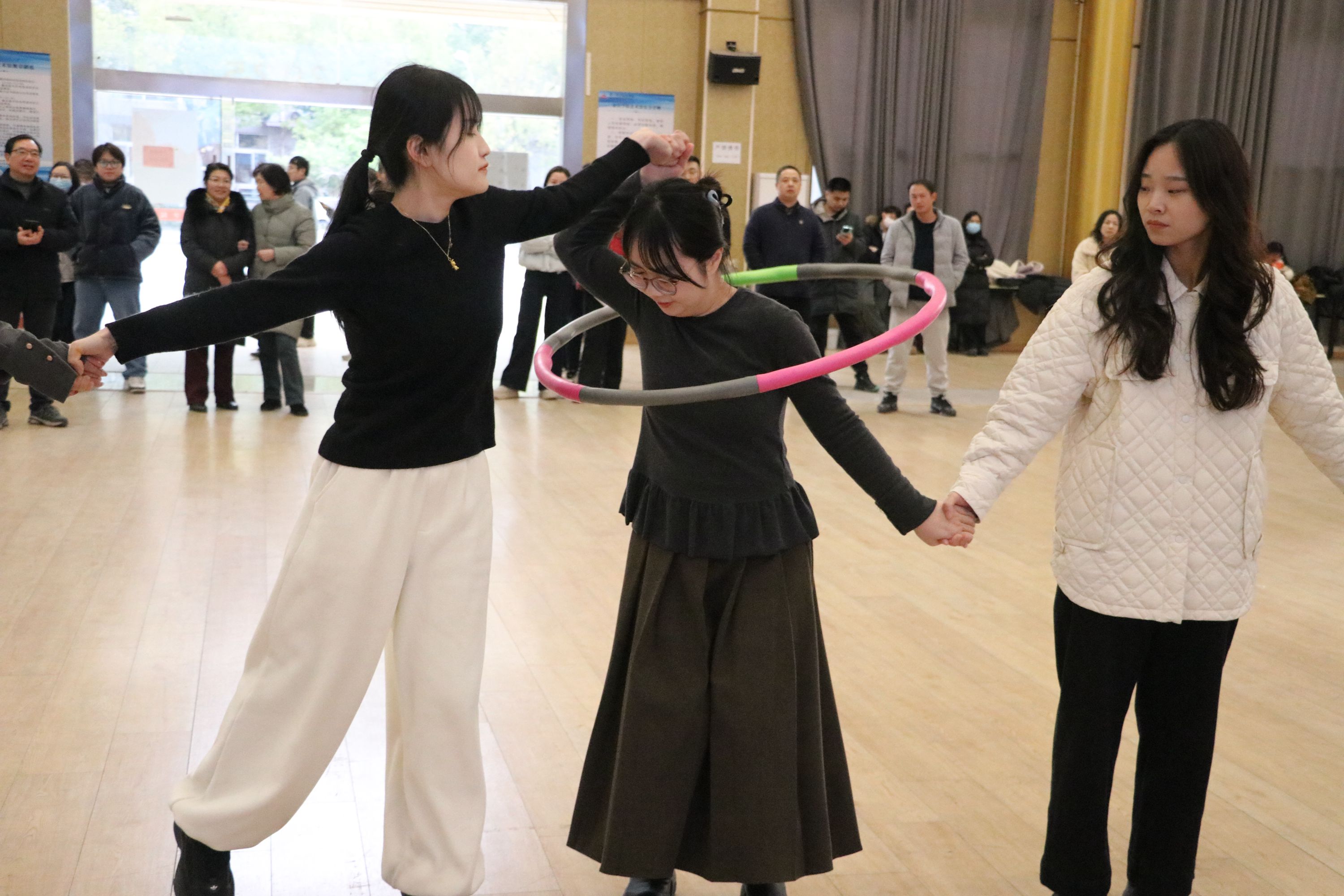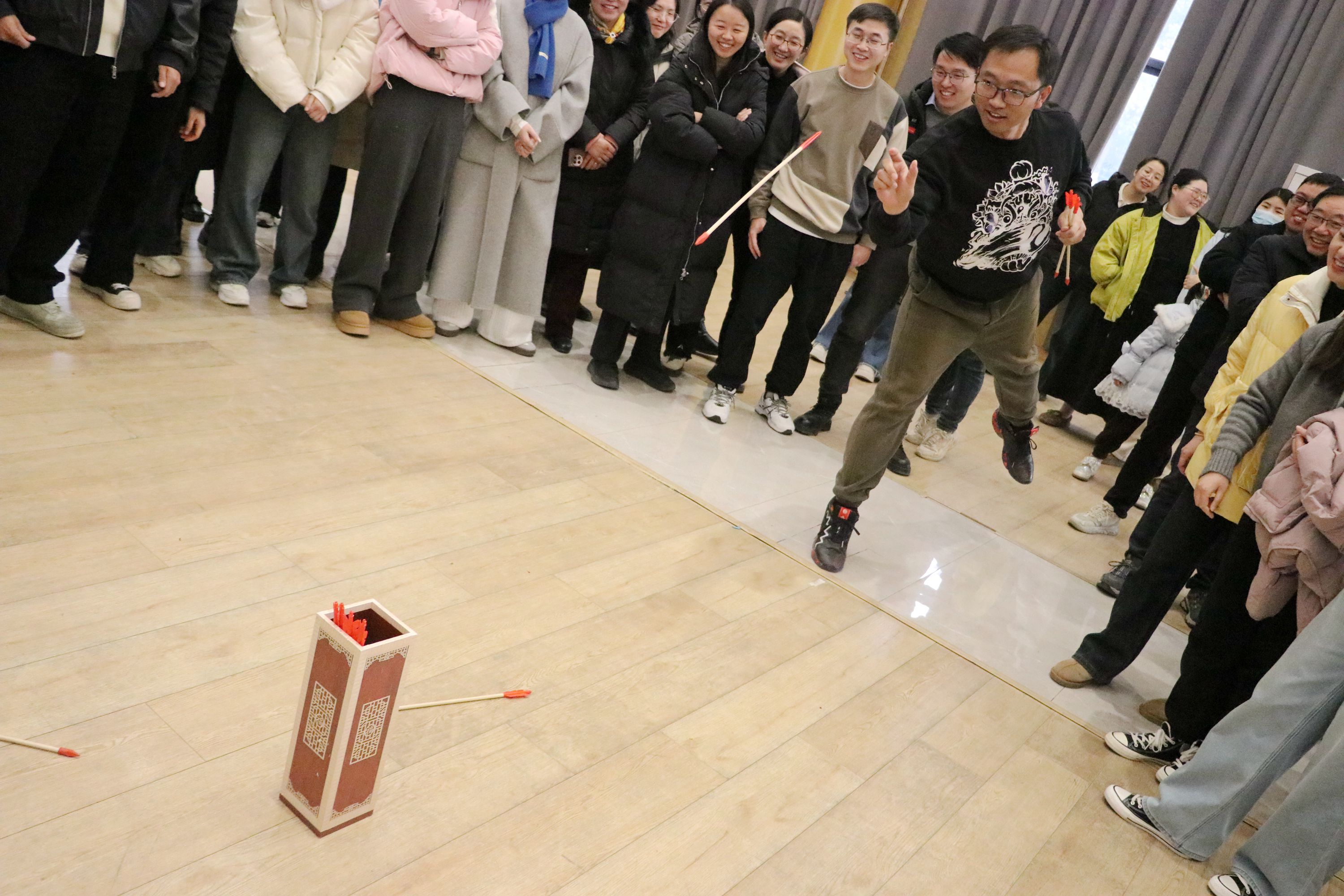 艺术馆内,一圈到底的比赛同样扣人心弦,各团队成员手牵手围成圈🫦,呼啦圈在他们之间快速穿梭🔯,大家目光专注、动作敏捷。投壶比赛现场则充满了技巧与专注,选手们站在起点线后🦸🏿,手持箭矢😣,屏气凝神🧔🏿♀️,每一次命中都引发阵阵喝彩。